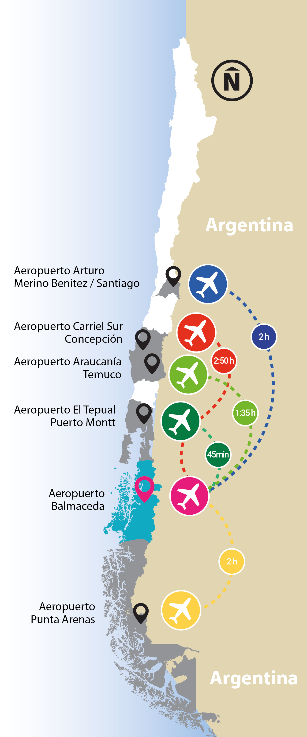 Constituye el medio más frecuente y eficiente para ingresar a la región. El aeródromo de Balmaceda es el único de la región y se ubica a 56 km de la ciudad de Coyhaique. Desde este lugar puedes trasladarte hacia la capital regional en transportes privados que se encuentran disponibles a tu llegada: transfer, taxi o, si lo prefieres, arrendar un vehículo, a través de las empresas de rent a car que se encuentran autorizadas.