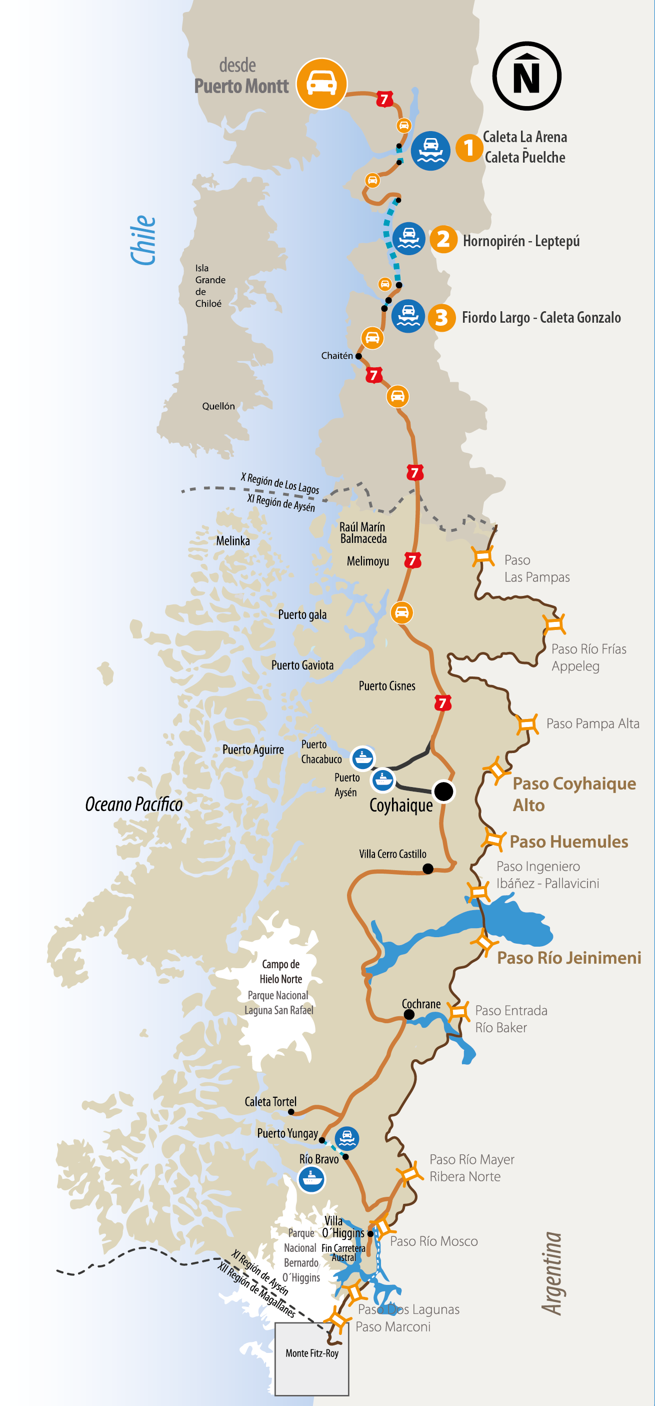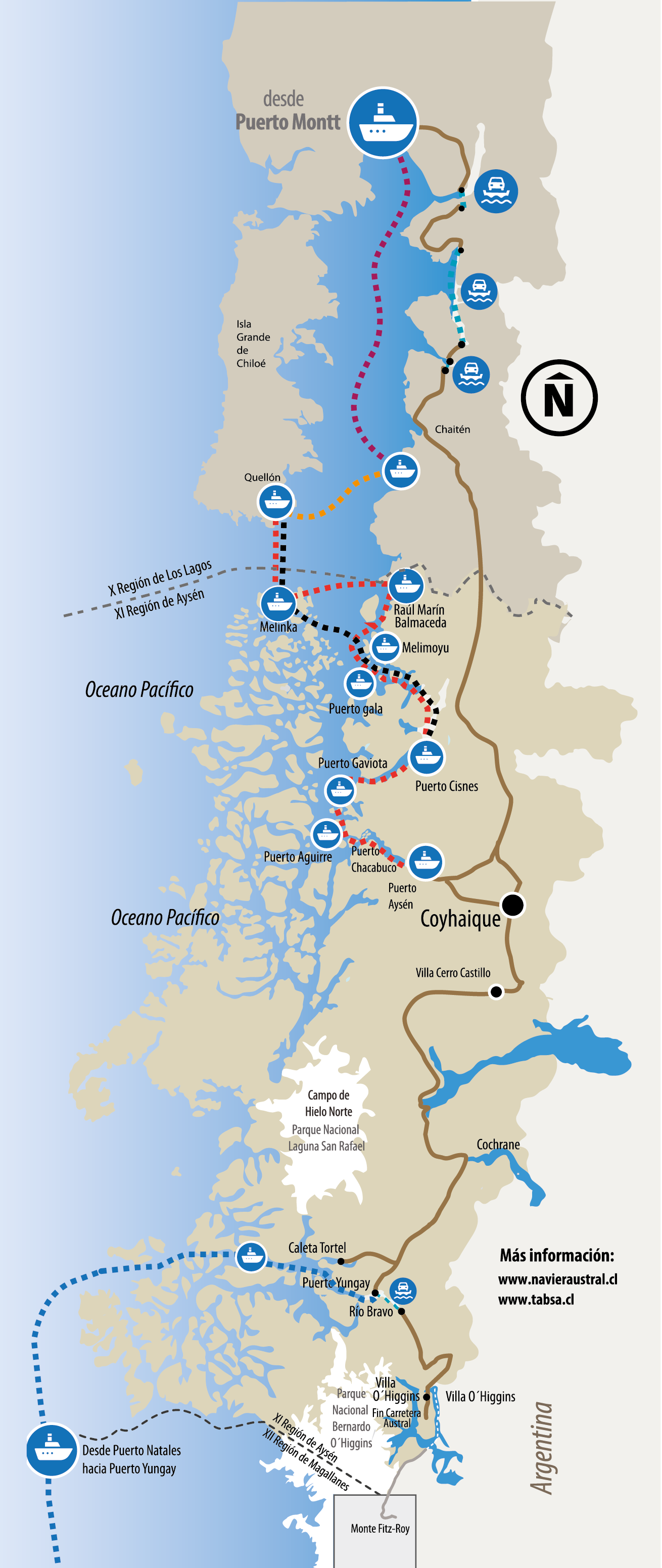 Desde la ciudad de Quellón en la Isla Grande de Chiloé, es posible tomar un transbordador hacia Chaitén o conectar con otras localidades más al sur como Melinka, Raúl Marín Balmaceda y Puerto Cisnes. Desde Puerto Montt, en tanto, también es posible tomar un transbordador hasta la localidad de Chaitén. Desde el año 2016, además, se implementó la ruta que conecta las regiones más australes de Chile: Aysén y Magallanes, a través de una barcaza que zarpa desde Puerto Natales con destino a Puerto Yungay (Automóviles) y Caleta Tortel (solo pasajeros).