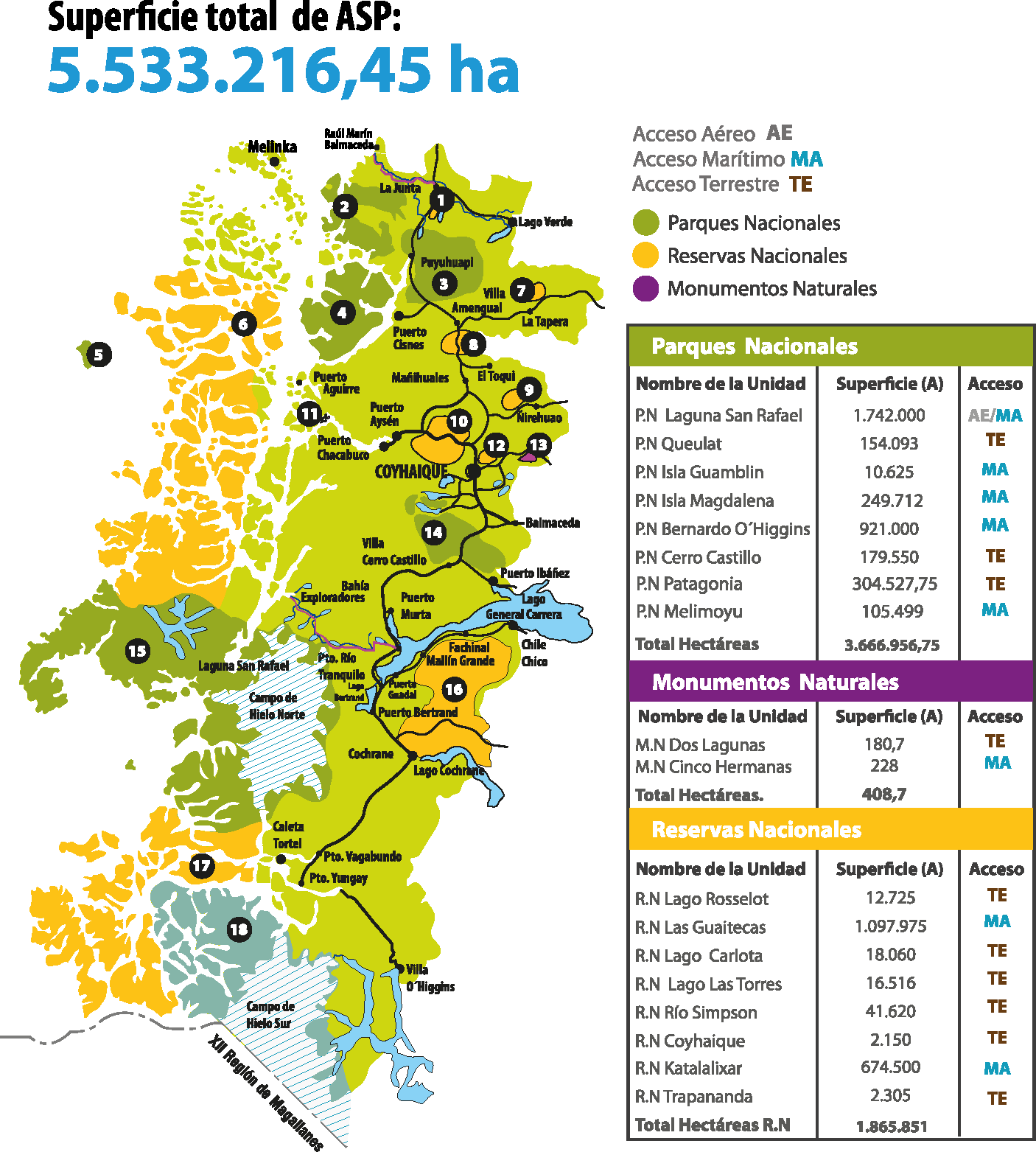 Adicionalmente, el Destino Aysén Patagonia forma parte de la denominada Ruta de los Parques, iniciativa de conservación impulsada por Tompkins Conservation y la fundación Rewilding Chile. Es una ruta escénica que reúne un total de 17 parques nacionales, recorriendo 2.800 kms entre Puerto Montt y Cabo de Hornos. En Aysén la Ruta de los Parques considera seis Parques Nacionales: